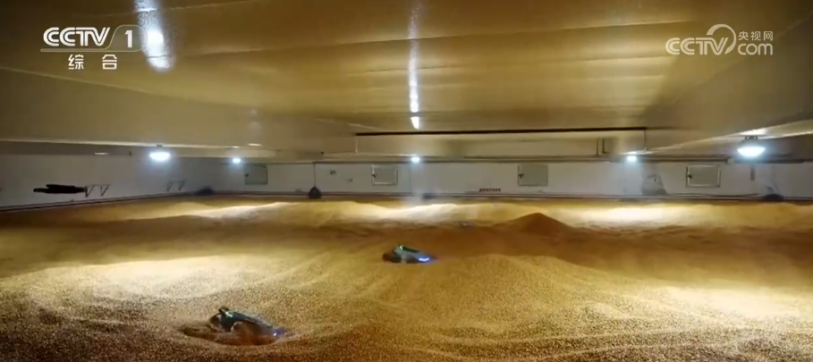 通过这个观察窗口,可以看到这个海缆探测机器人在水下作业的情况。它还搭载了磁探器和光谱探测器,可以自主对海底的电缆进行巡检,就像在医院里做一个超级CT,海缆的各种损伤都难逃它的法眼。 “大力士”平仓机器人走进粮仓