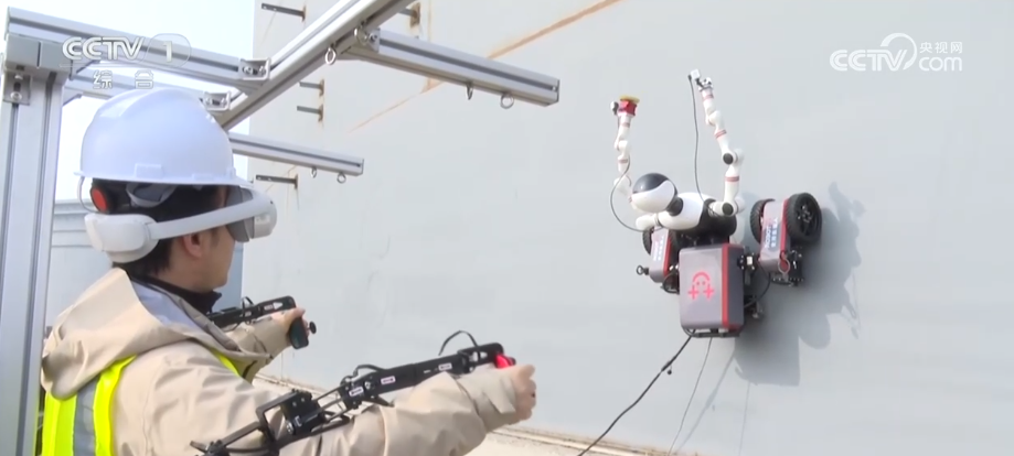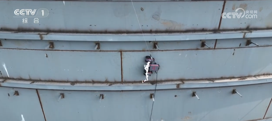 这是我国首个具身智能特种机器人,随着镜头拉开旋转发现原来它如履平地的工作场景竟然是一个垂直的墙面,这是一个正在施工中的巨型化工储罐。这个机器人上半身是一个人形机器人的造型,它的下半身则是非常稳定的“轮式+磁吸底盘”,这款机器人它的自重大约90公斤。您可能会担心,这么重在垂直的墙面上它不会掉下来吗?我们来做个试验:它强大的电磁性能不仅能确保它自己在金属罐体上行走自如,即便是吊着一个140多斤的成年人也并不影响它飞檐走壁灵活作业。