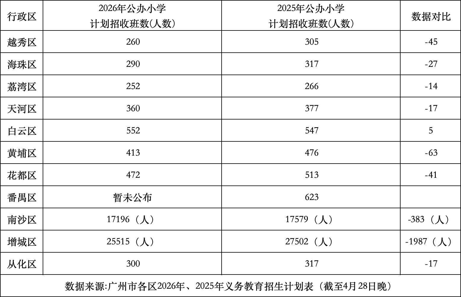从广州各区已公布的数据来看,2026年广州义务教育阶段的公办学位供给呈现出明显的“小学收缩、初中扩容”分化态势。
